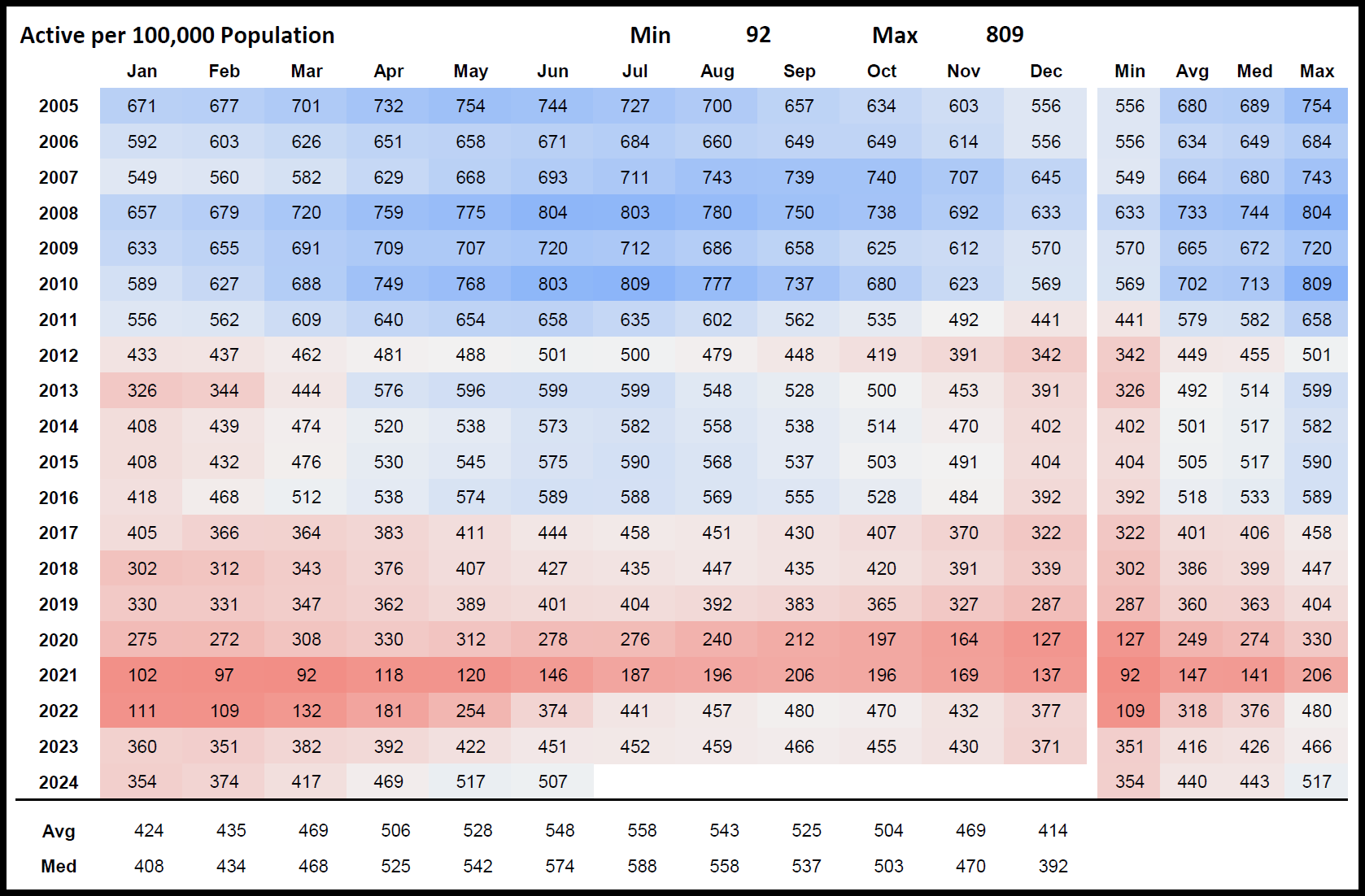 In addition to these findings, the population-adjusted data provides another layer of understanding. When adjusted for population, the Austin-area MLS would need 20,200 active listings to reach a record high. The historical data from 2005 to 2024 shows how the number of active listings per 100,000 population has varied significantly over the years. For example, the highest values were recorded in June 2008 (804) and June 2010 (809), while the lowest values were observed in 2021, with a minimum of 92 in April.
