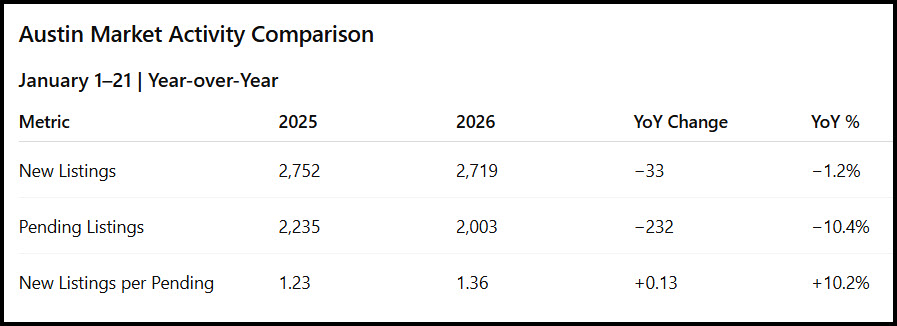 The early January data is sending a clear and measurable signal about how the Austin real estate market is behaving as 2026 gets underway, and the message is not coming from one headline number but from the relationship between supply and demand itself.