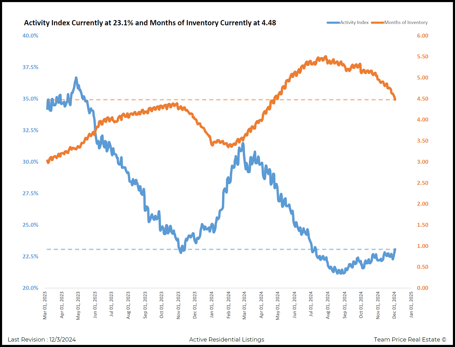 December 03, 2024 : The Austin-area real estate market shows signs of strengthening as of December 3, 2024, with key indicators reflecting improved conditions for both buyers and sellers. Two essential metrics—Activity Index and Months of Inventory—highlight the current state of the market and provide a detailed look at recent trends in Austin real estate.