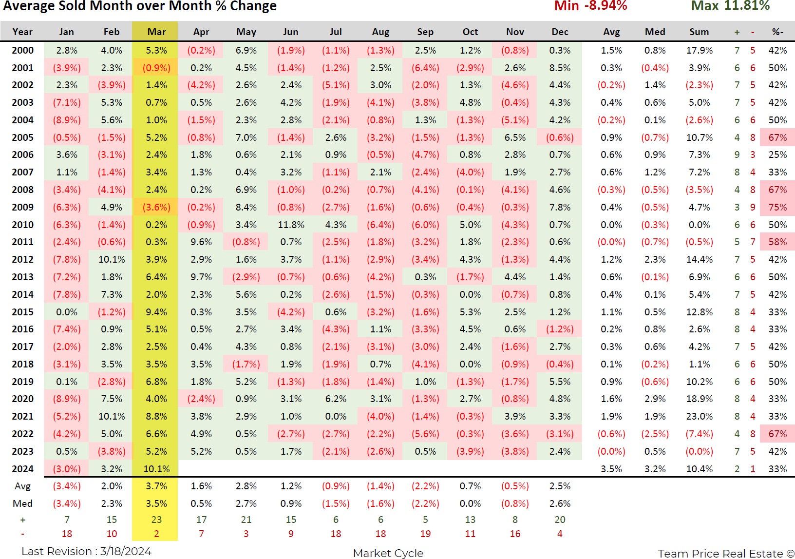 The Trend of March Movements: A 24-Year Overview : March month-over-month percentage change has varied greatly over the years: The early 2000s saw moderate increases, peaking at 5.3% in the year 2000. The mid-2000s experienced stability with figures hovering around the 2-3% mark. The late 2000s, impacted by broader economic conditions, presented a mix of modest growth and minor declines. The 2010s marked a return to gradual growth, with occasional spurts such as the 6.4% rise in 2013 and the notable 9.4% in 2015. The 2020s began with a 4.0% increase, showing resilience in the market, and the upward trajectory has been consistent with 2024 setting a new benchmark. The consistent growth, with the exception of a few downturns, reflects the resilience and dynamism of the Austin real estate market, even when considering the usual end-of-month adjustments that tend to normalize the average sold prices.