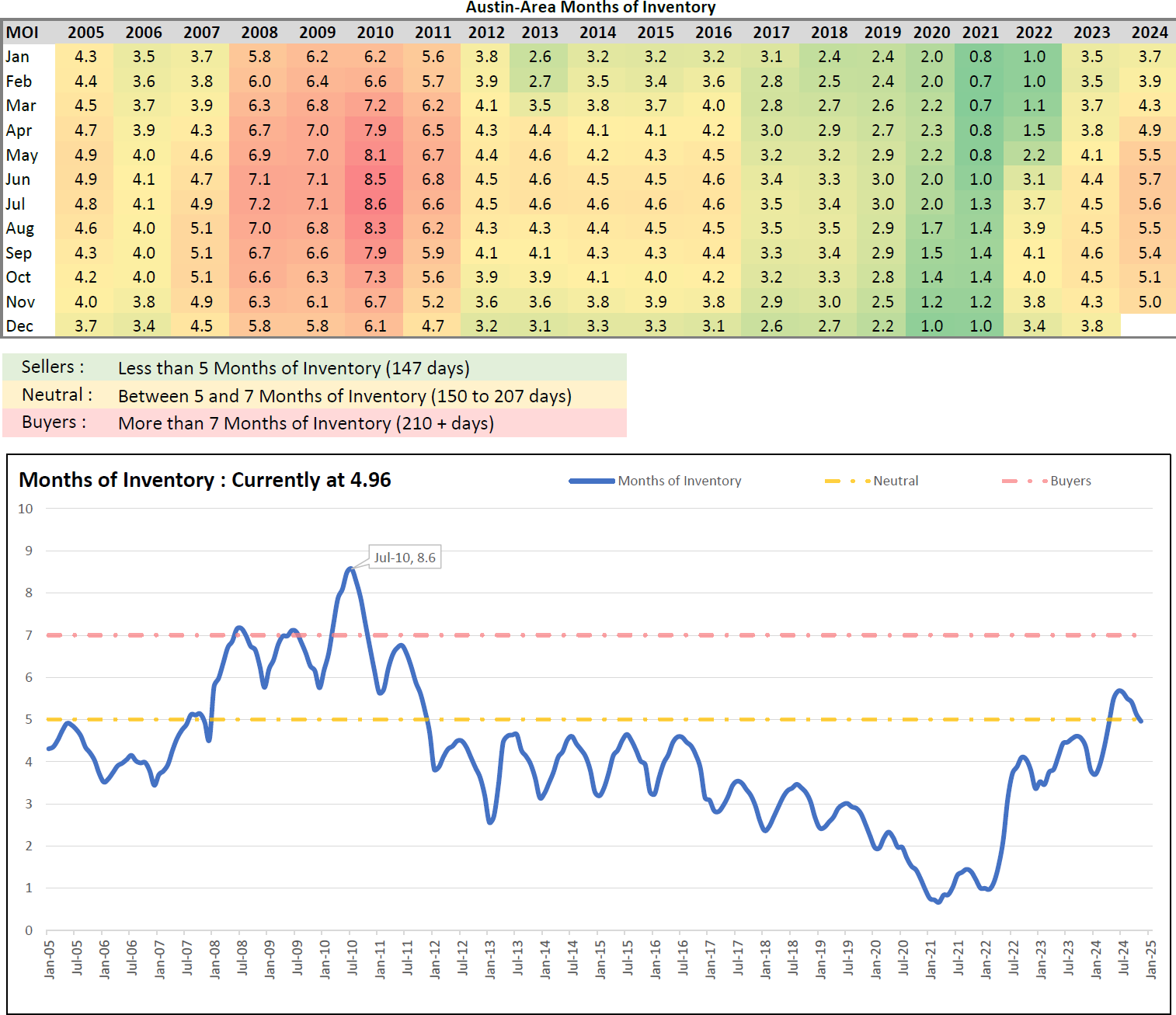 Over the past two decades, Austin's real estate market has experienced various cycles, from the stability of the mid-2000s to the turbulence of the financial crisis, and the booming seller's market during the pandemic years. Historically, the Austin area has seen MOI fluctuate based on broader economic trends, local housing demand, and changing interest rates. For context, during the financial crisis in 2009-2011, the MOI surged to levels as high as 8.6 months, reflecting a sharp drop in buyer demand and a significant increase in available listings. In stark contrast, the pandemic-driven market of 2020-2021 recorded some of the lowest inventory levels in history, with MOI dropping to as low as 0.7 months, driven by a surge in buyer demand and limited new listings.