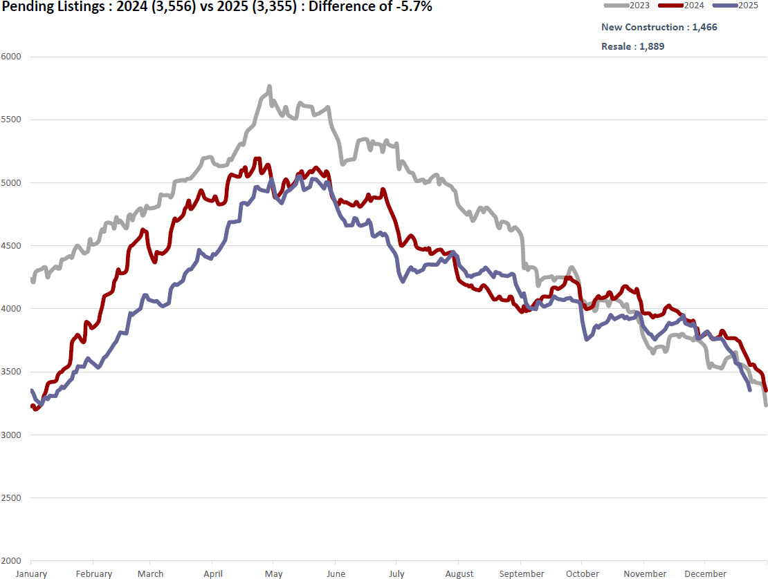 Yes. The current pending count of 3,355 is the lowest level recorded since mid-January 2025. January is typically a seasonal low point, so returning to that level at year-end suggests demand softness beyond normal seasonality in the Austin housing market.