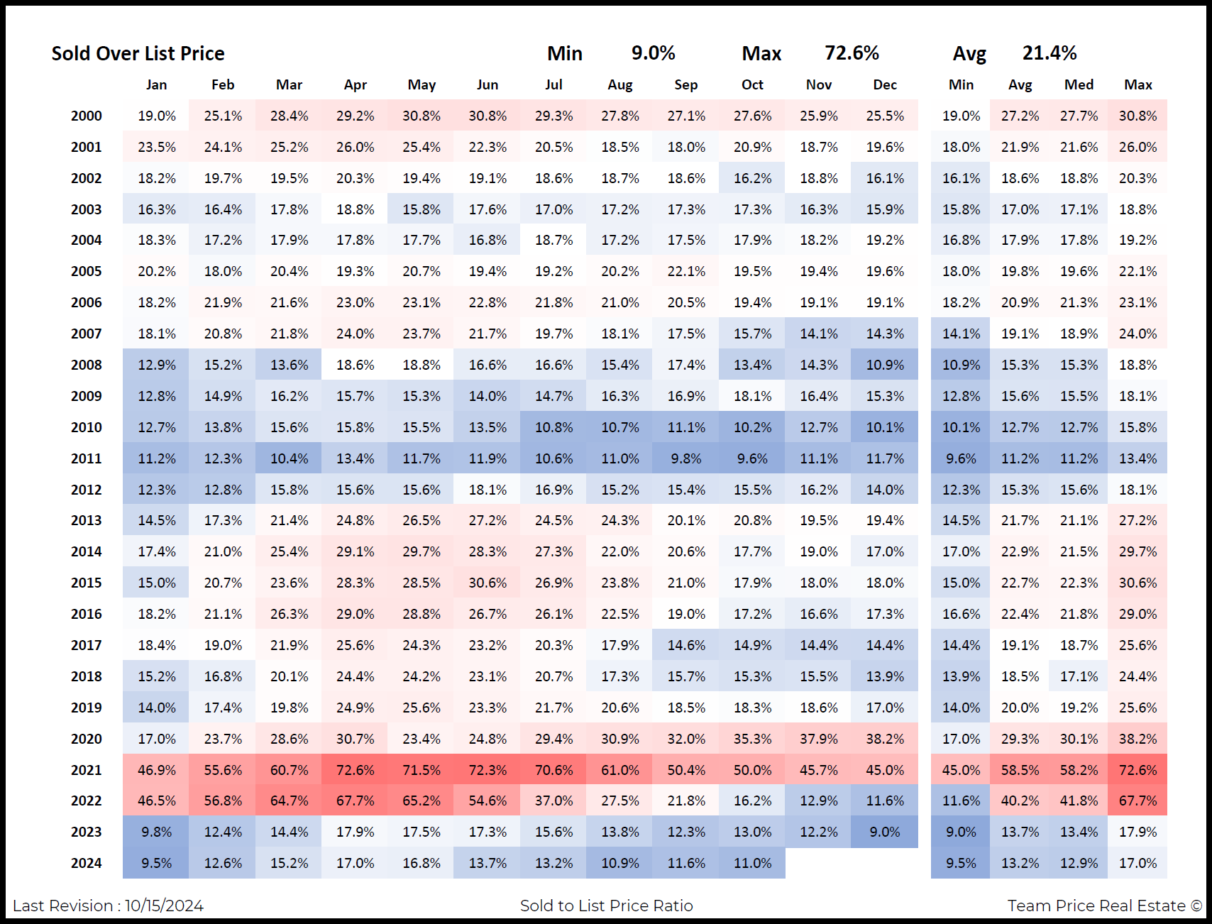 In 2023, the market continued its downward trend, with percentages stabilizing to levels last seen before 2011. For example, the highest percentage of over-list sales was in April at 17.9%, a significant decrease compared to the peaks of previous years. As of October 2024, Austin’s real estate market is seeing the lowest percentage of properties sold over list price in over a decade, reflecting a new era where buyers have greater opportunities to purchase homes without the need to outbid list prices.