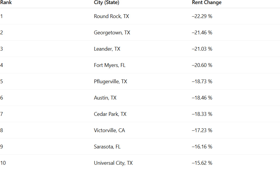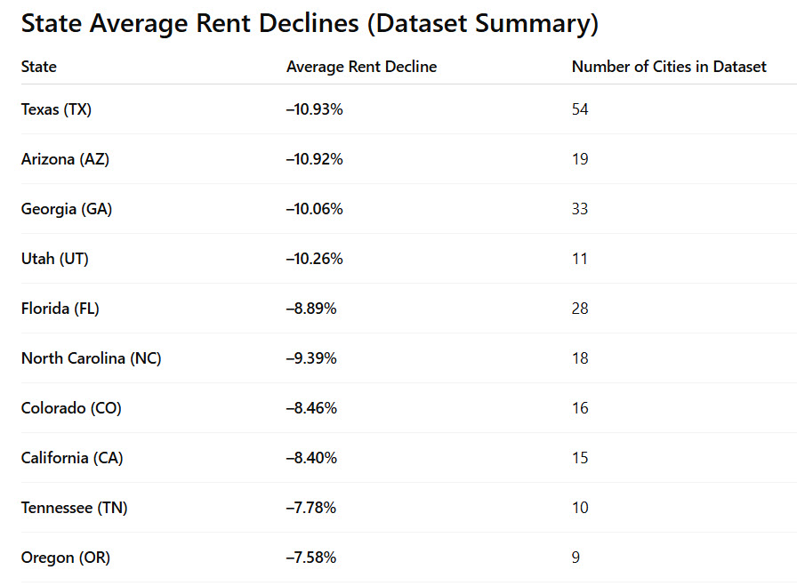 When shifting from Austin-area markets to statewide trends, the picture remains consistent. Texas accounts for 54 cities on the national list of rent declines, more than any other state by a wide margin. The average decline across all Texas markets in the dataset is –10.93 percent. This statewide average reflects not just the Austin region, but also the Dallas–Fort Worth, San Antonio, and Houston metros, each of which shows a large cluster of mid-single-digit to low-double-digit declines. Texas is among the fastest-correcting rental markets in the country because it has been one of the most active construction markets for several years. As new units enter the market and compete for the same renters, prices adjust downward to clear the inventory.