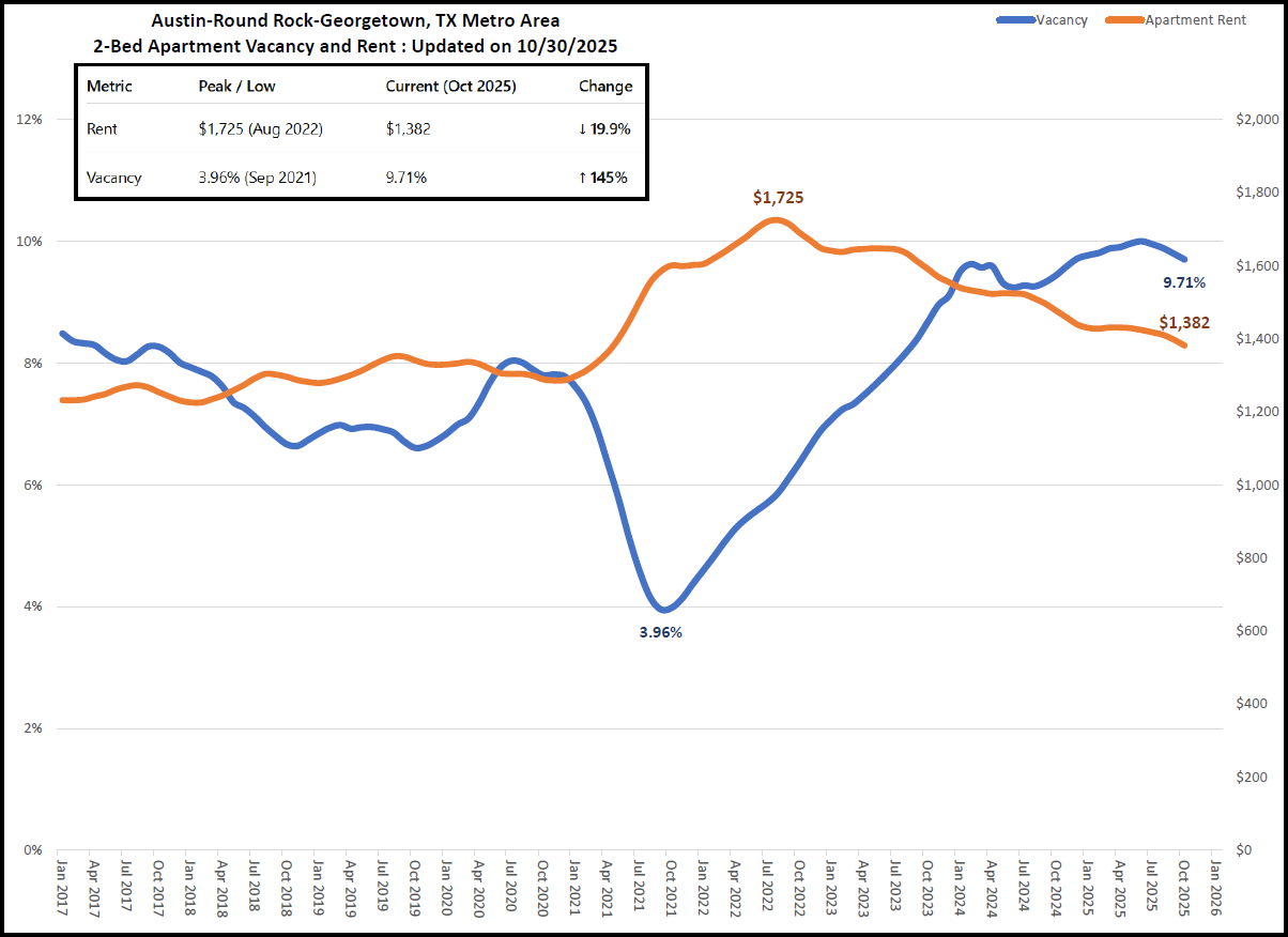 The Austin area apartment market has entered a clear rebalancing phase. After years of rent acceleration and tight supply, 2-bedroom units are now showing the strongest signs of normalization since 2016. According to Apartment List’s rent estimates data, the average rent for a two-bedroom apartment in the Austin area peaked at $1,725 in August 2022 and has since fallen to $1,382 as of October 2025—a 19.9% decline from the market high. Over the same period, vacancy rates have surged from 3.96% to 9.71%, marking a 145% increase. These twin shifts reflect both a correction in pricing and a structural adjustment in Austin’s multifamily housing balance.