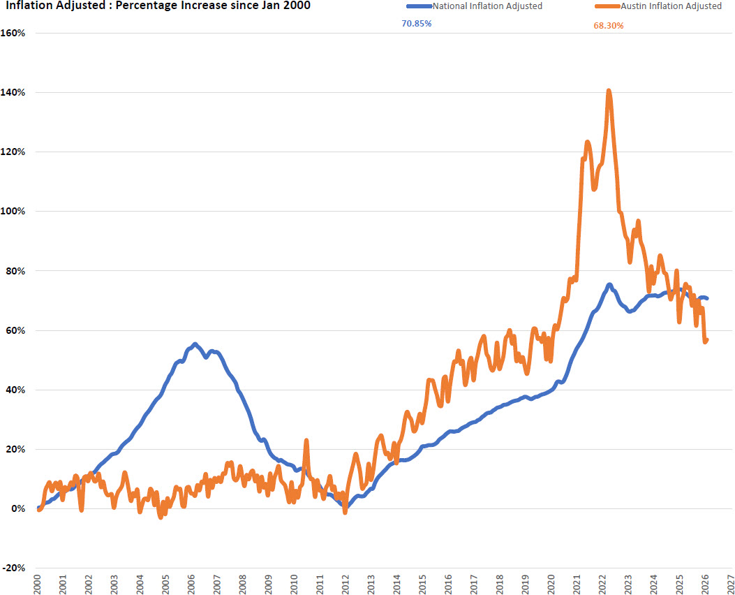 After all the volatility, here is where the two markets stand as of February 2026: National inflation-adjusted gain since January 2000: 70.85 percent. Austin inflation-adjusted gain since January 2000: 68.30 percent. For the first time in years, Austin is trailing the national market on a cumulative real-return basis going back to 2000. The runaway outperformer narrative needs updating. Austin's surge was real. So was the correction.