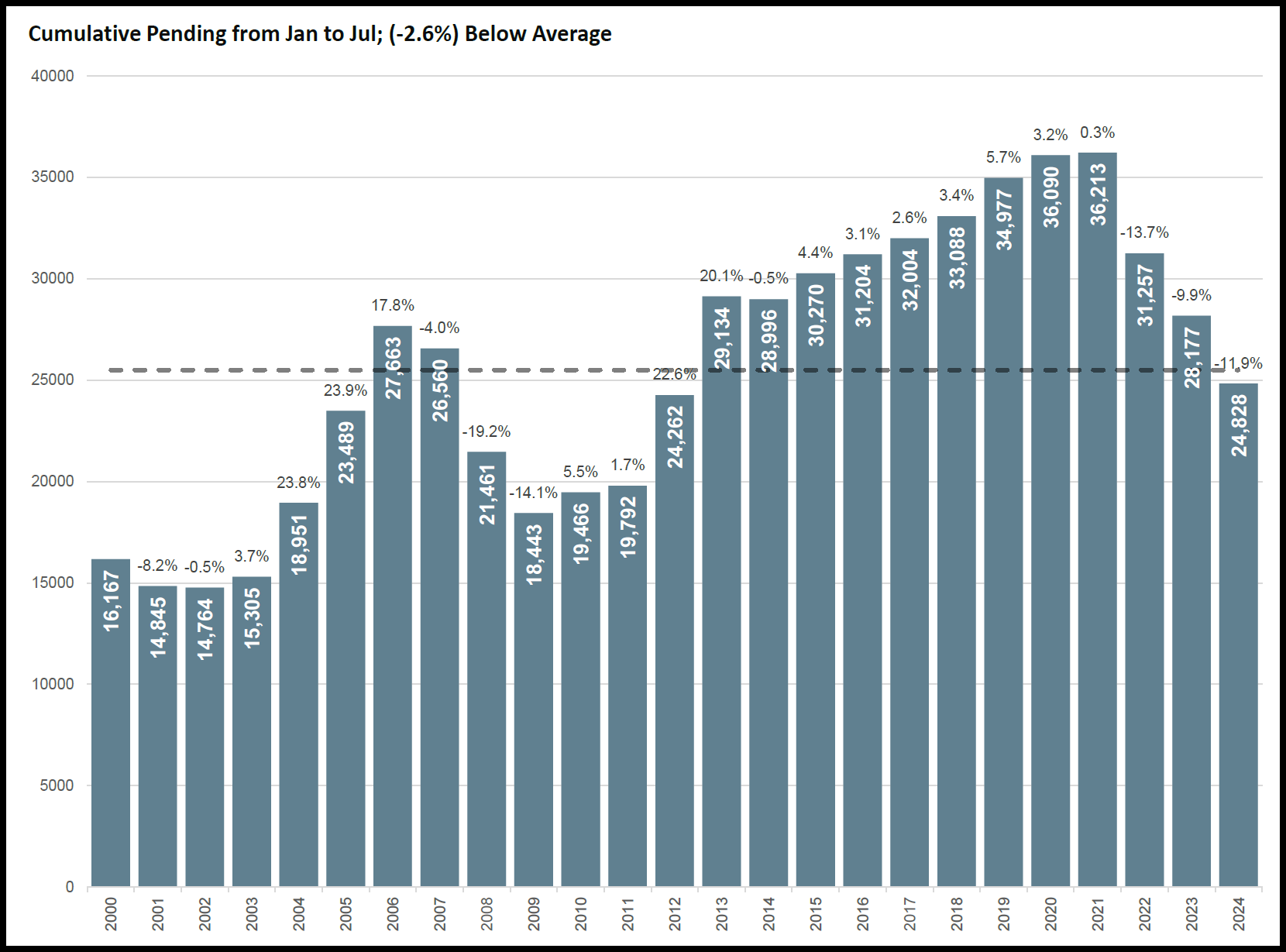July 09, 2024 : The Austin Metropolitan Statistical Area has experienced significant shifts in its real estate market over the past two decades. By examining cumulative pending properties from January to July for each year between 2000 and 2024, we gain valuable insights into the market’s evolution, trends, and fluctuations.