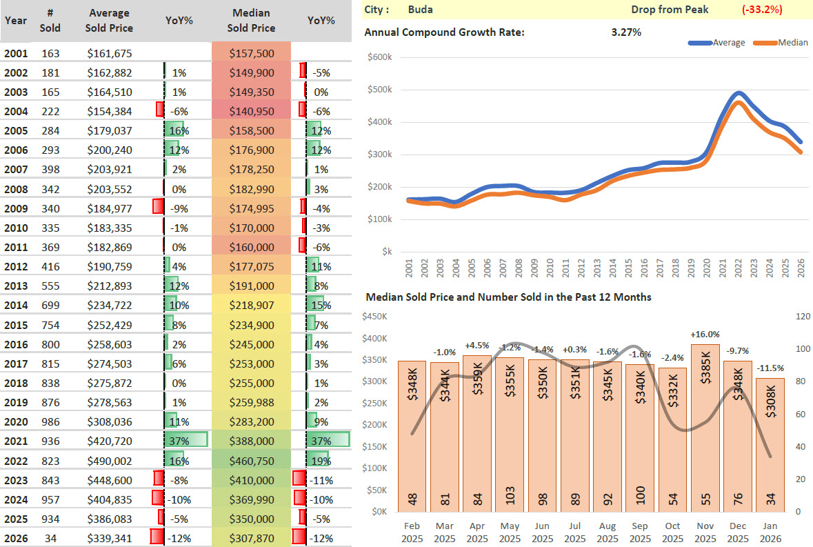 Buda is still in a correction, and the data makes that plain. After the 2021–2022 surge, prices have been working lower for three straight years, and the market is now running far below peak levels. If you want to understand where the Buda segment of the Austin real estate market sits today, this dataset gives you the full story from 2001 to early 2026, including the boom, the pullback, and what “bottoming” would need to look like to be real.