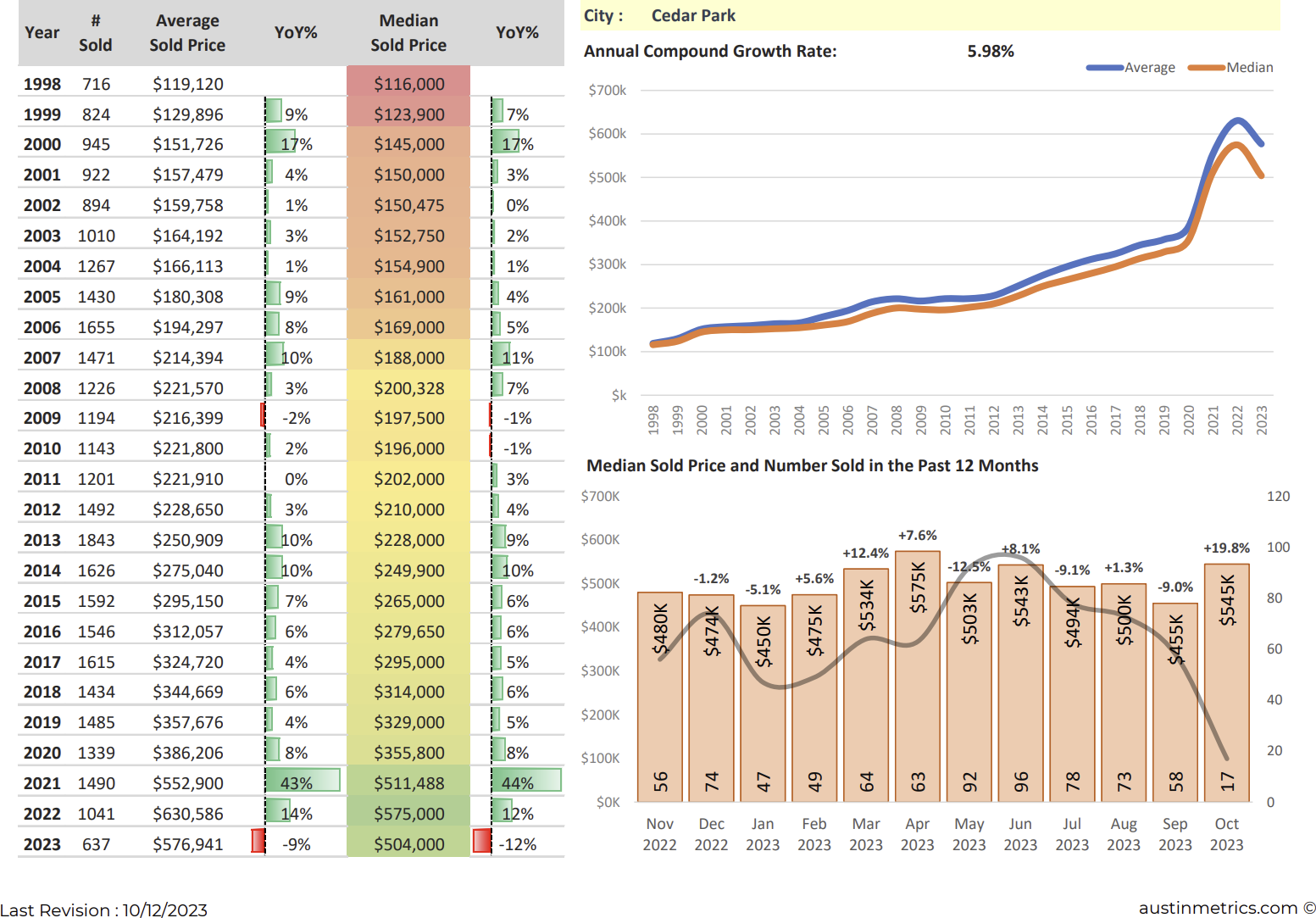 One interesting pattern is the growth rate. If we examine the annual compound growth rate, both the average and median sold prices have grown at an impressive rate of 5.98%. This tells us that Cedar Park has consistently been a place where home values appreciate.