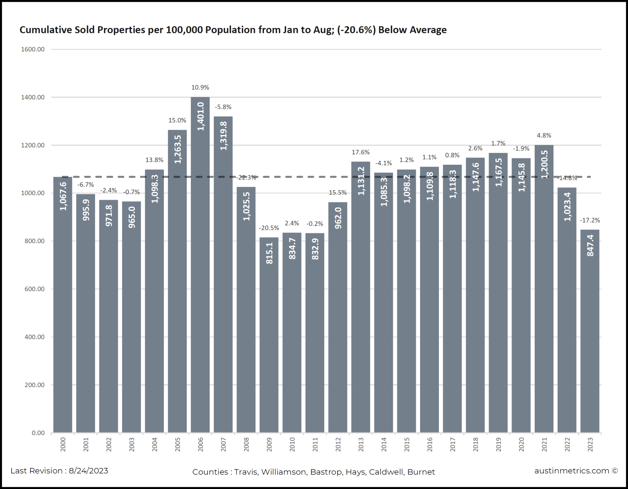 Looking at the data cumulatively from January to August each year, sold properties in 2022 are 8.0% above the average, despite the monthly drop in August. This indicates that early 2022 was strong for Austin real estate transactions before slowing down over the summer.