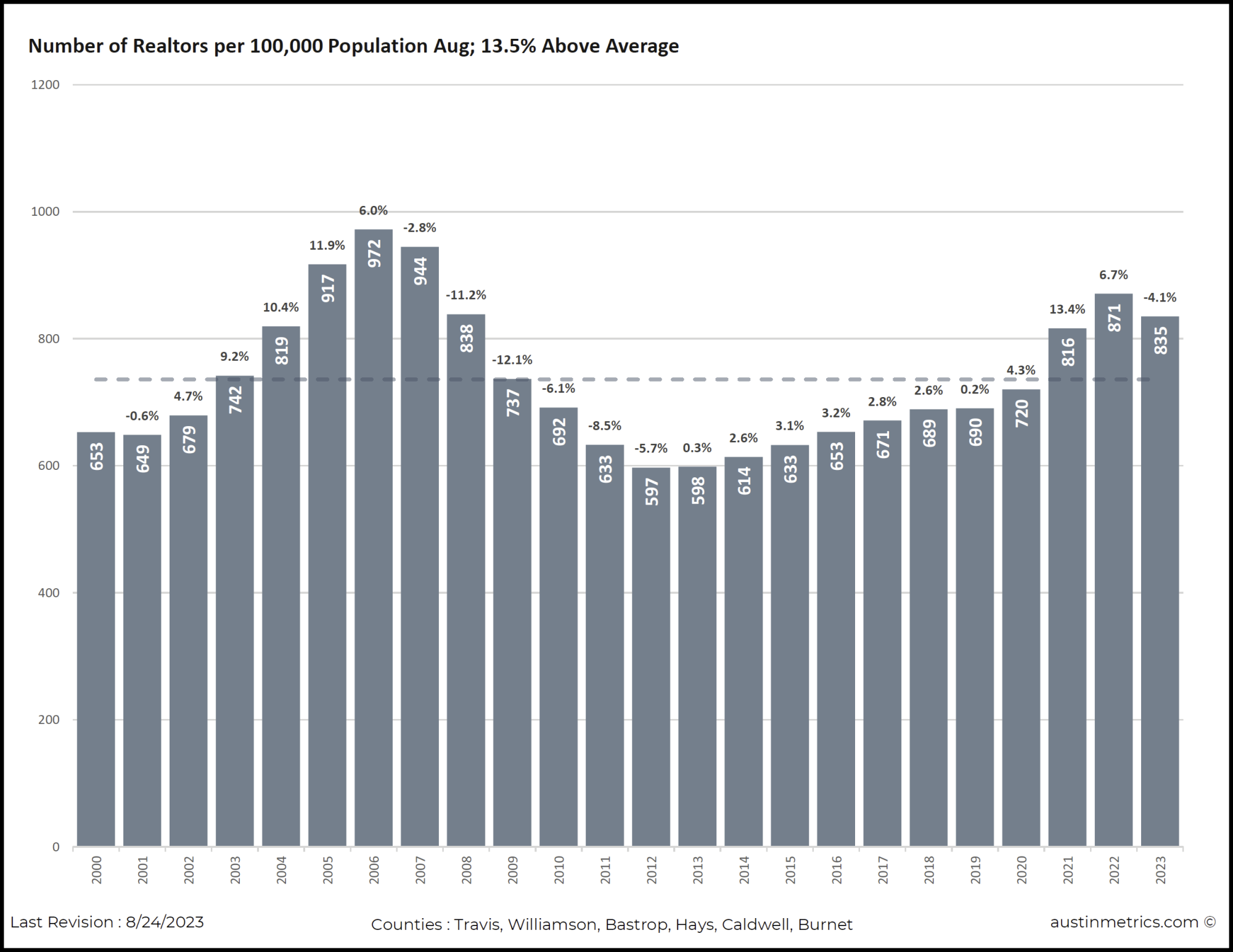 The number of realtors in the Austin MLS has increased dramatically since 2000, reaching over 20,000 in August 2022. This is a 59.4% increase compared to the August average of 13,296 realtors. However, when accounting for Austin's population growth, realtors per 100,000 residents in August 2022 are only 13.5% above average.