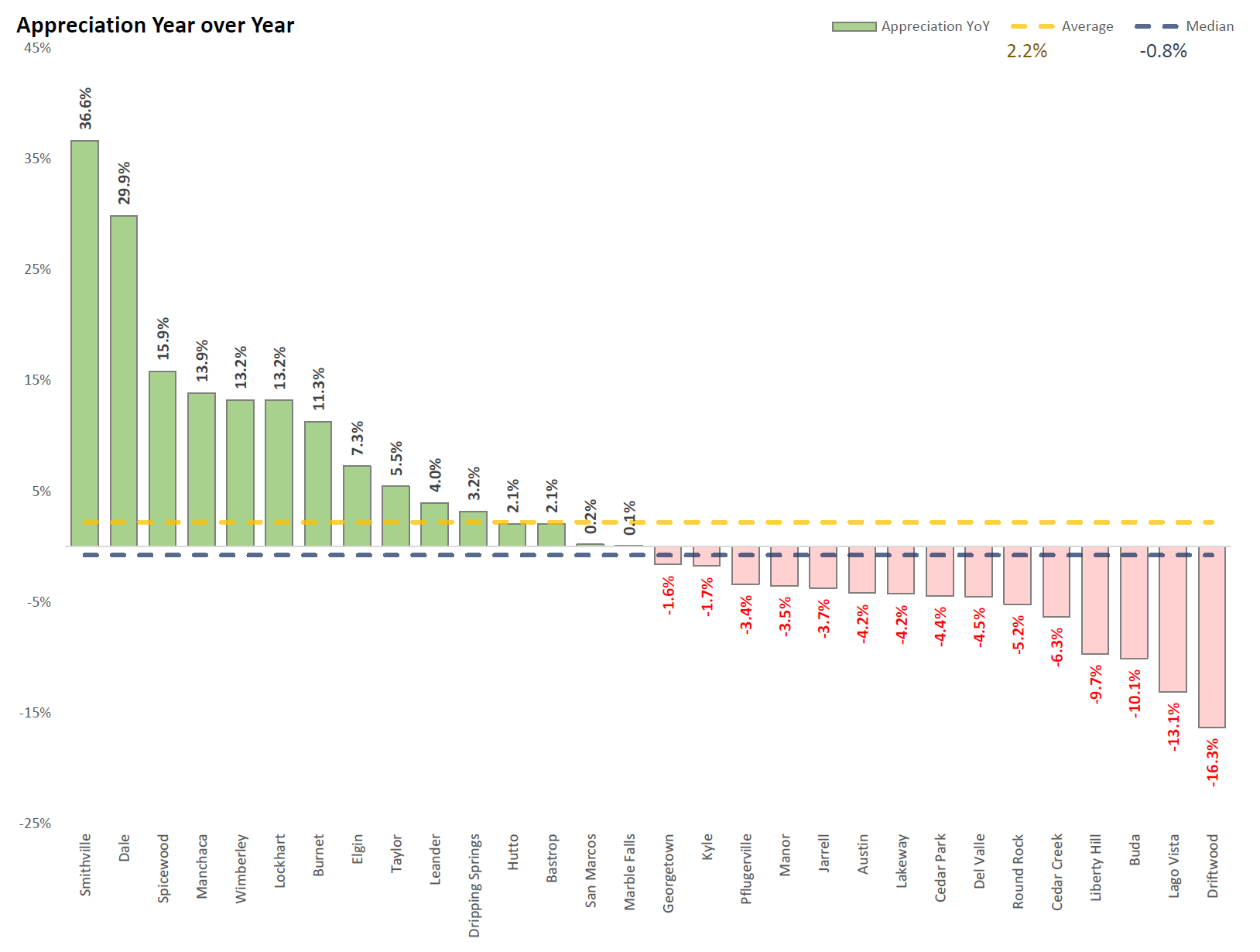 Cities like Dale, Smithville, and Spicewood emerged as the top performers in terms of percentage growth. Dale astonishingly surged by 29.9%, Smithville by 36.6%, and Spicewood by 15.9%, showcasing significant investor confidence and possibly demographic shifts or infrastructural developments fueling these increases. On the contrary, Driftwood, Lago Vista, and Liberty Hill experienced the most substantial declines, with Driftwood's prices falling by 16.3%, Lago Vista by 13.1%, and Liberty Hill by 9.7%, reflecting adjustments possibly due to market corrections or changes in local demand dynamics.