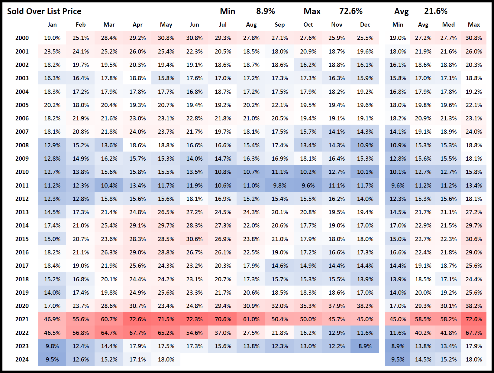 The most remarkable year in this data set is 2021. Throughout this year, the market reached unprecedented levels of competitiveness. The percentage of properties sold over list price soared, with April 2021 seeing the highest recorded percentage at 72.6%. This period reflects a market where buyers were frequently willing to pay well above the listed price to secure a property, driven by a combination of high demand and limited supply.
