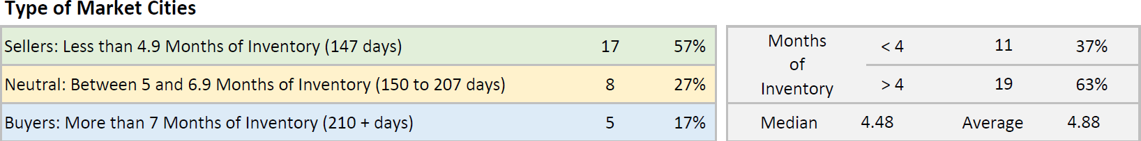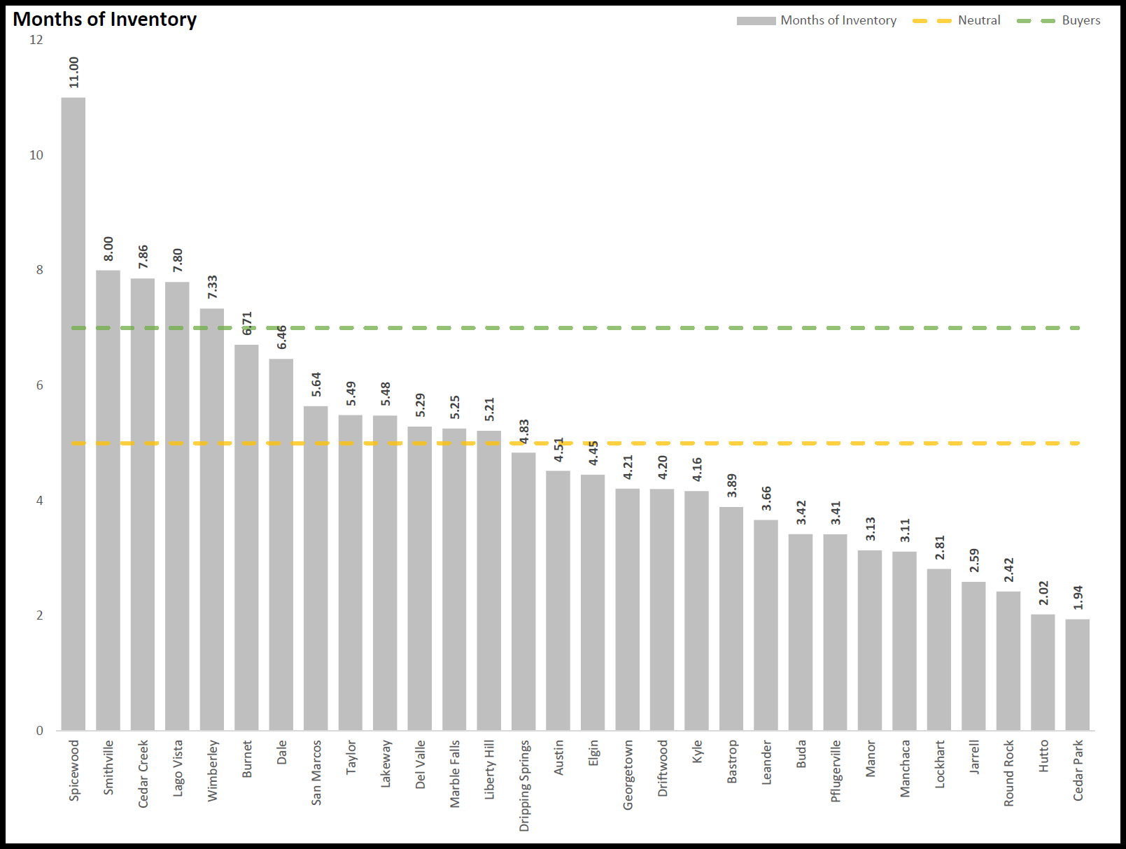 Cities with More Than 7 Months of Inventory : A buyer's market exists in cities with more than 7 months of inventory, where the supply exceeds demand, giving buyers more negotiating power. In the Austin area, five cities, or 17% of the total, are in this category. Burnet stands out with 7.8 months of inventory, indicating a significant surplus of homes. Other cities in this group include Cedar Creek with 6.7 months, Dale with 7.3 months, and Driftwood with 5.6 months. These cities present opportunities for buyers to find favorable deals.
