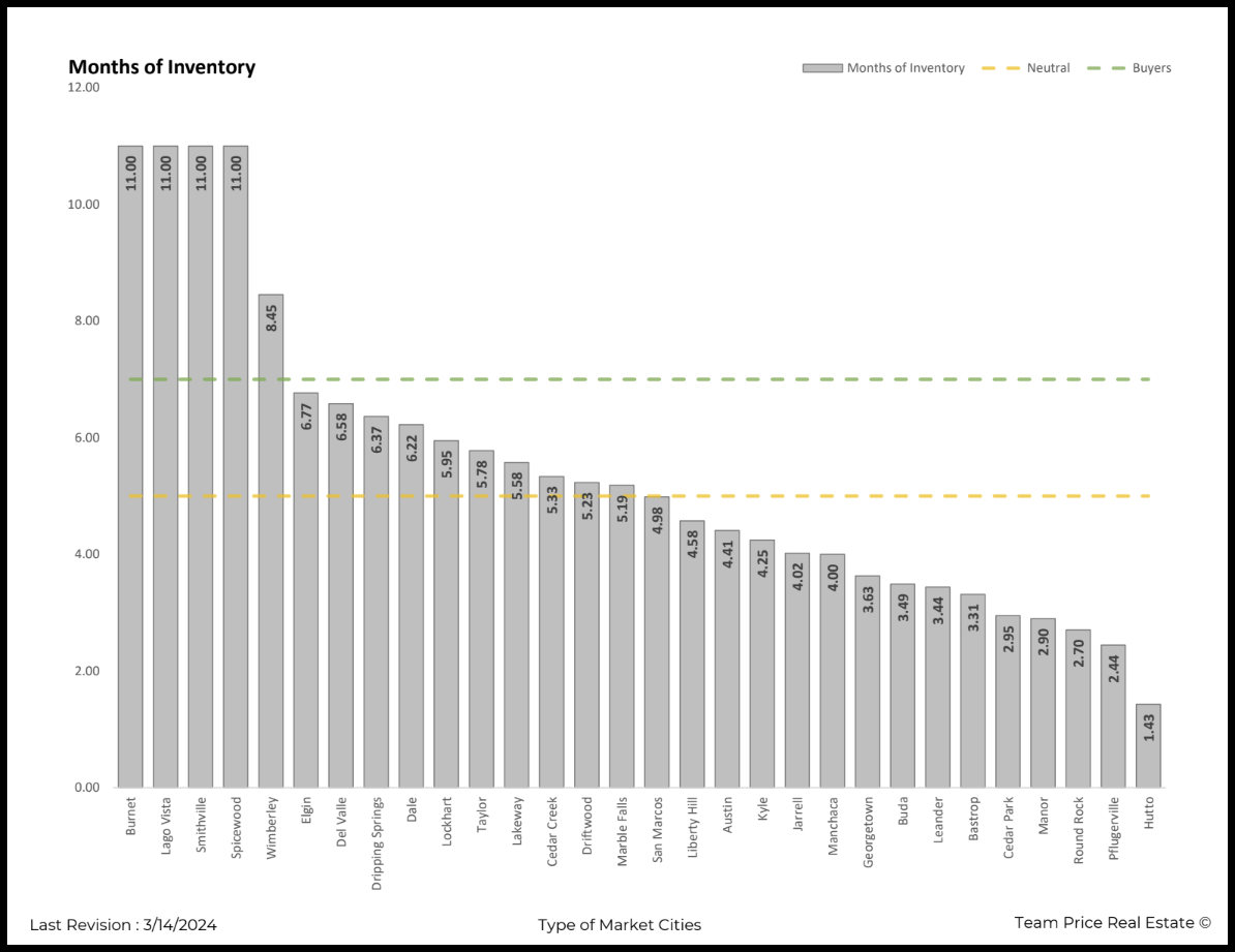 As of today, March 14th, 2024, the insights and analysis presented in this article reflect the current state of Austin's real estate market, capturing the nuances of the "Months of Inventory" across various cities. It's important to note that this information is dynamic, changing daily based on fluctuations in inventory availability and sales activities over the past 90 days. For those seeking the most current and up-to-date analysis of the market conditions by city, a wealth of resources and updates can be found at Type of Market: Navigating Central Texas Real Estate - In-Depth Insights for 30 Cities. Team Price Real Estate offers real-time insights, ensuring you have access to the latest data to make informed decisions in the ever-evolving Austin real estate landscape.