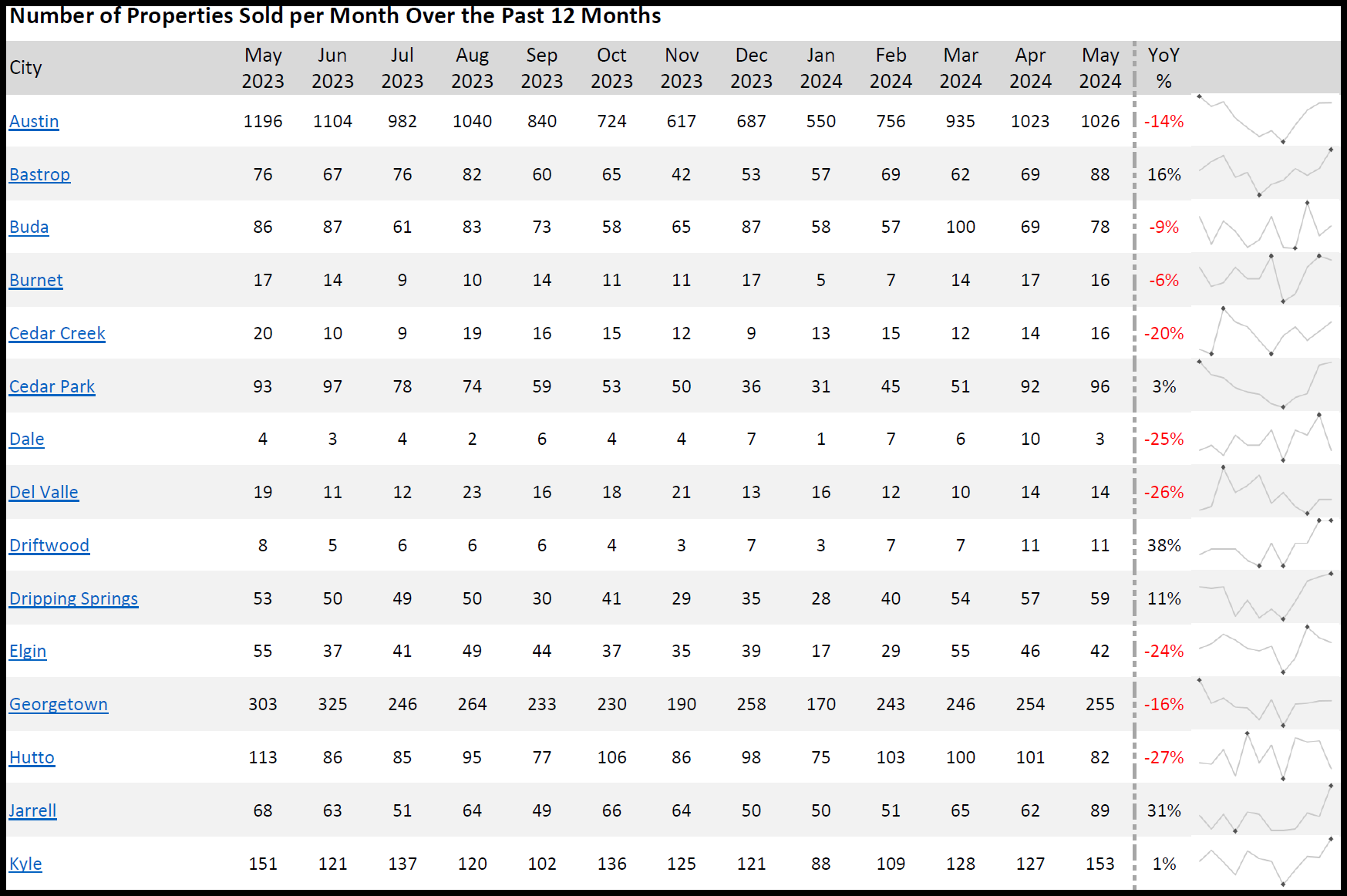 In Austin, the number of properties sold showed a notable decrease from 1196 in May 2023 to 1026 in May 2024, marking a 14% year-over-year decline. This downward trend was not isolated to Austin alone. Nearby cities like Cedar Creek also saw a reduction in sales, with numbers dropping from 20 in May 2023 to 16 in May 2024, reflecting a 20% decrease.