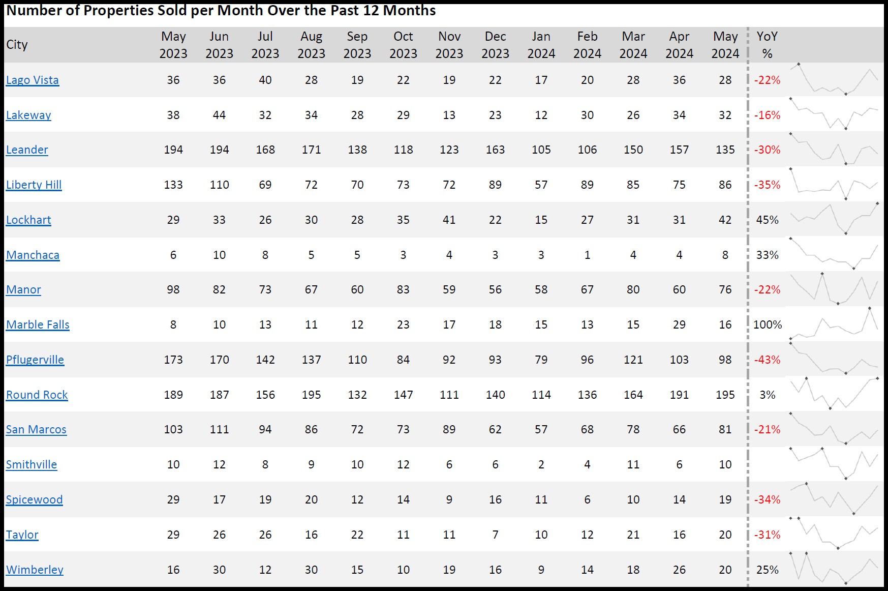 Conversely, some cities experienced growth in property sales. Bastrop, for instance, saw an increase from 76 properties sold in May 2023 to 88 in May 2024, a 16% rise. Similarly, Jarrell showed a positive trend with a 31% increase, jumping from 68 properties sold in May 2023 to 89 in May 2024.