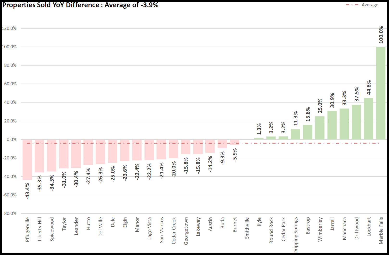 The overall trend across the region indicates a mixed market with some areas experiencing growth while others face declines. The average year-over-year difference in properties sold across all cities was -3.9%, reflecting the varied performance in the real estate sector.