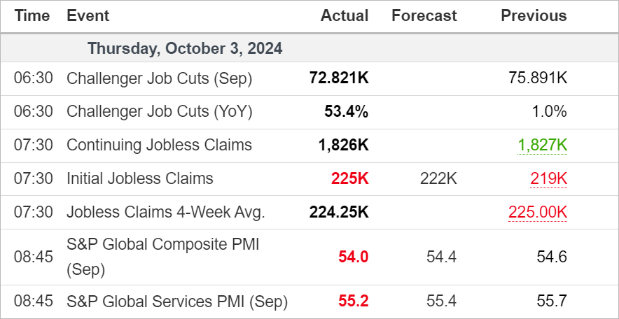 In addition to the Challenger report, the labor market data further complicates the economic outlook. The latest figures on Initial Jobless Claims came in at 225,000 for the week ending October 3, 2024, slightly higher than the forecasted 222,000 and an increase from the previous week’s 219,000. While the rise is modest, it indicates a slight uptick in unemployment claims. However, the four-week moving average, which smooths out volatility, stood at 224,250, slightly lower than the forecast of 225,000. This signals that, while layoffs are increasing, the labor market has remained relatively resilient.