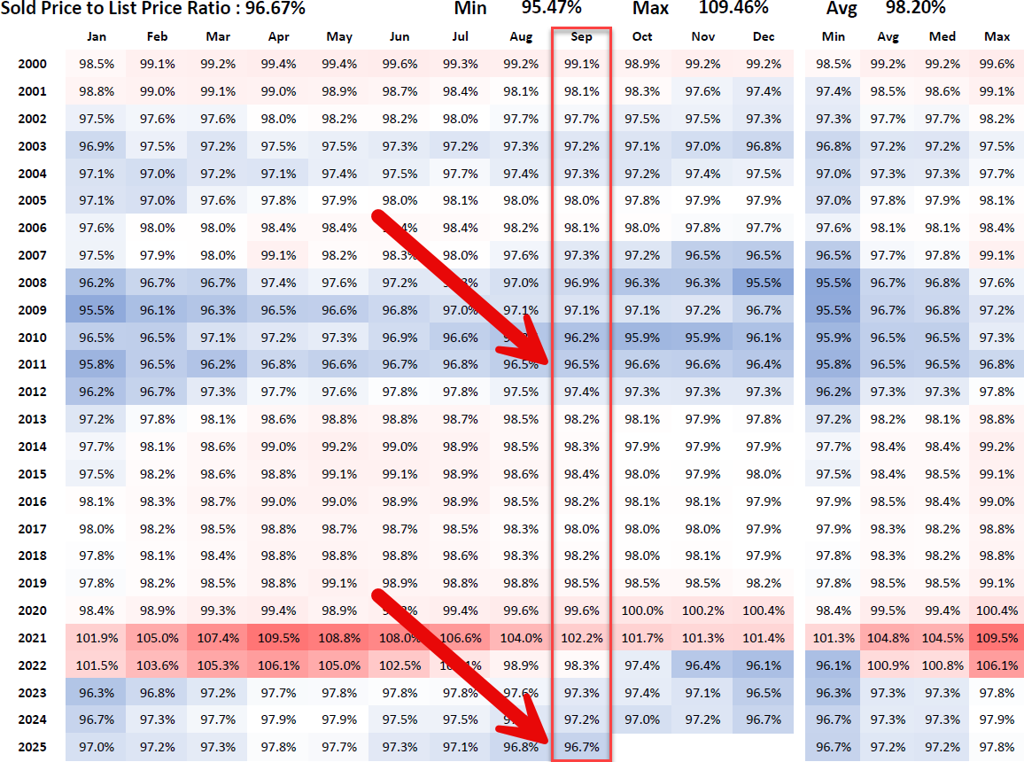 September 2025’s sold-to-list price ratio of 96.7% sends a clear message: the Austin real estate market has shifted decisively toward buyers. This is the lowest September ratio in 14 years, marking a sustained departure from the overheated highs of 2021. Sellers who hope to close deals in this environment must price with precision and remain flexible. Buyers, on the other hand, should view this as an opportunity to enter negotiations from a position of strength.