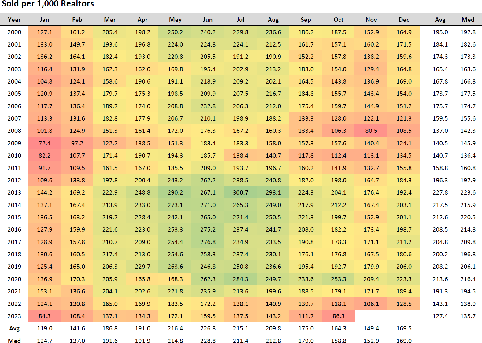 From the year 2000 to 2023, there appears to be an overall increasing trend in the number of properties sold per 1,000 realtors, suggesting a growing market or increasing efficiency of realtors over this period. Short-Term Fluctuations: The market has seen short-term dips in 2008-2009, which might correlate with the global financial crisis. A more recent dip can be observed in 2023, indicating potential current market challenges or economic factors impacting the real estate market.