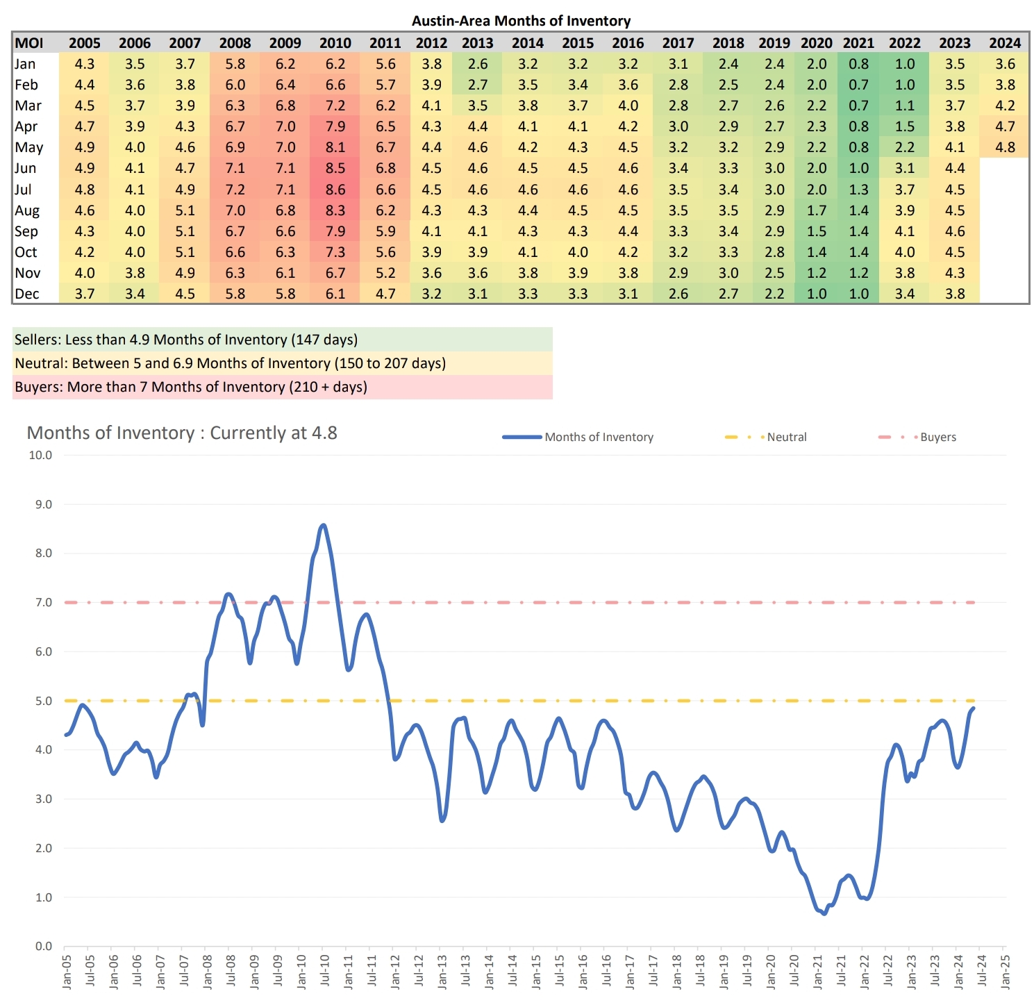 Analysis of MOI Trends in the Austin-Area: The MOI in the Austin-Area has experienced significant fluctuations over the past two decades, reflecting broader economic forces and local demand dynamics. Notably, during the 2008 financial crisis, the MOI surged above 7 months, clearly indicating a buyer's market as excess inventory accumulated. Conversely, the recent years leading up to 2021 saw the MOI plummet to less than a month, signaling a strong seller's market where homes sold rapidly at premium prices. As of 2024, the Austin-Area real estate market presents a balanced scenario with an MOI of approximately 4.8 months. This equilibrium suggests a stabilization in the market, ideal for maintaining long-term health without giving undue advantage to either buyers or sellers.
