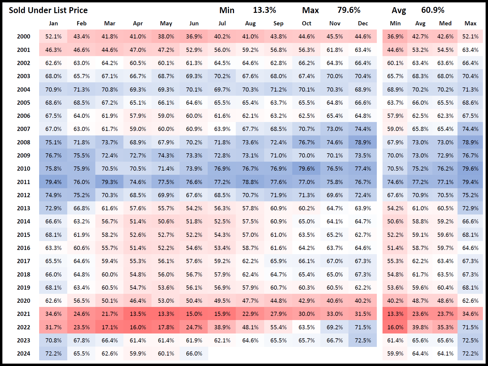 June 26, 2024 : The real estate market is always fluctuating, and understanding these changes is crucial for both buyers and sellers. This article examines the percentage of properties sold under the list price from January 2000 to the present month of 2024. By analyzing this data, we can gain insights into the market's past and present conditions, helping you make more informed decisions.