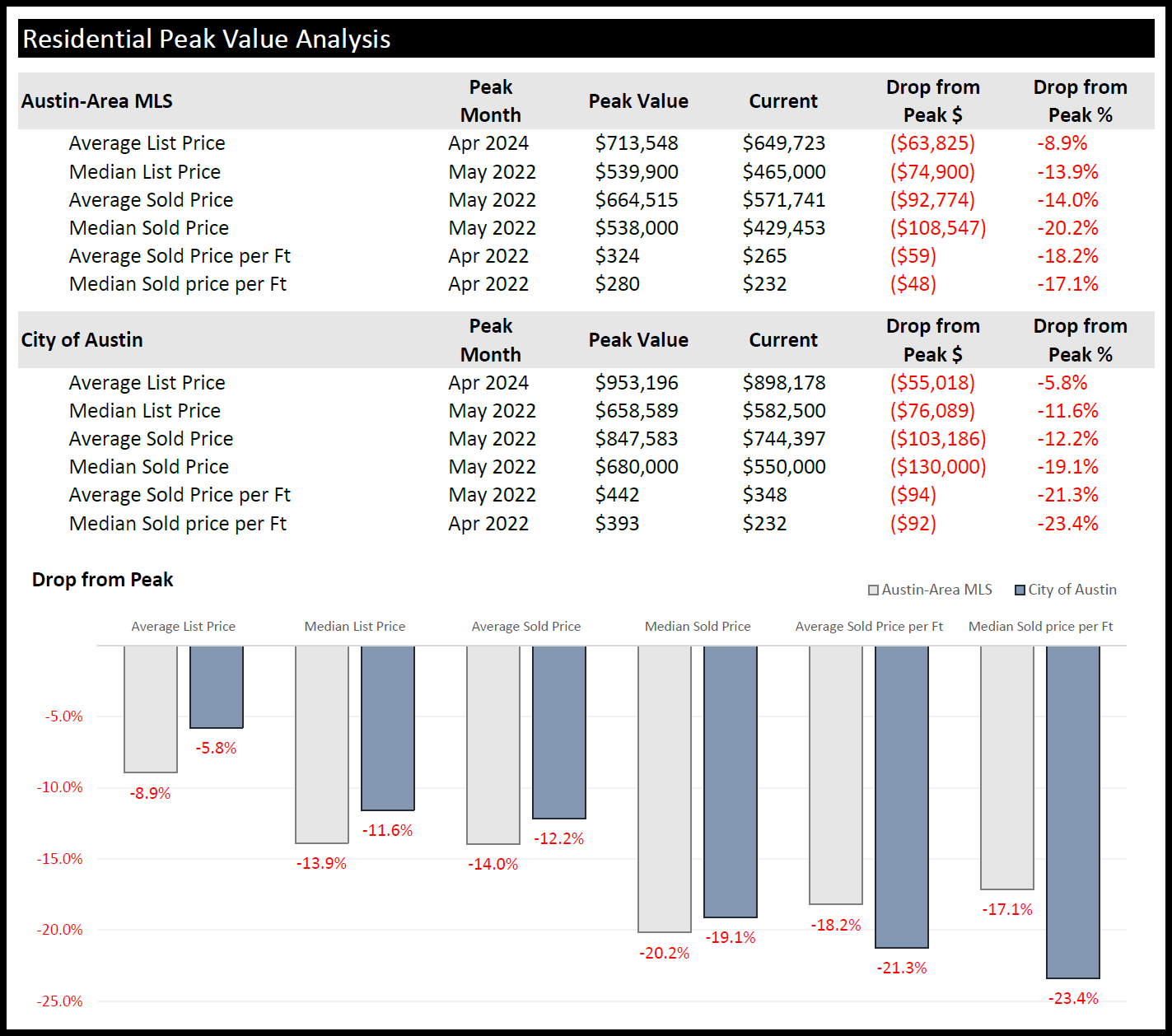 August 08, 2024 : The Austin real estate market has seen significant changes over the past few years. The Residential Peak Value Analysis provides a detailed look at the market trends, highlighting the shifts in property values from their peak times to the present day. This analysis is essential for anyone involved in the Austin real estate market, offering a clear picture of the current state and historical performance of residential properties.