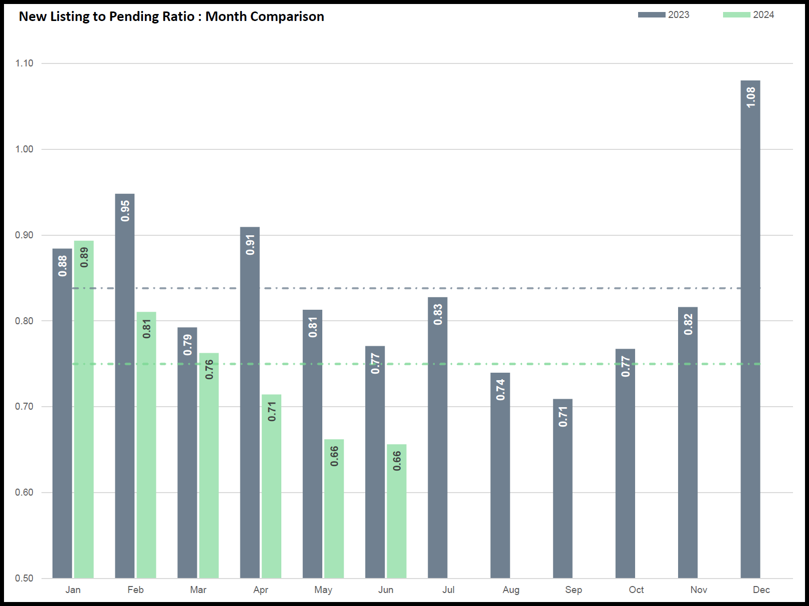 In 2024, the market showed continued trends of fluctuating ratios. January started with a ratio of 0.89, similar to the previous year, followed by a slight decrease to 0.81 in February. March saw a further drop to 0.76, indicating a rising inventory. April's ratio of 0.71 and May’s 0.66 continued this trend, with June maintaining the same ratio of 0.66. These numbers highlight an ongoing increase in inventory as the market absorbs fewer properties compared to new listings.