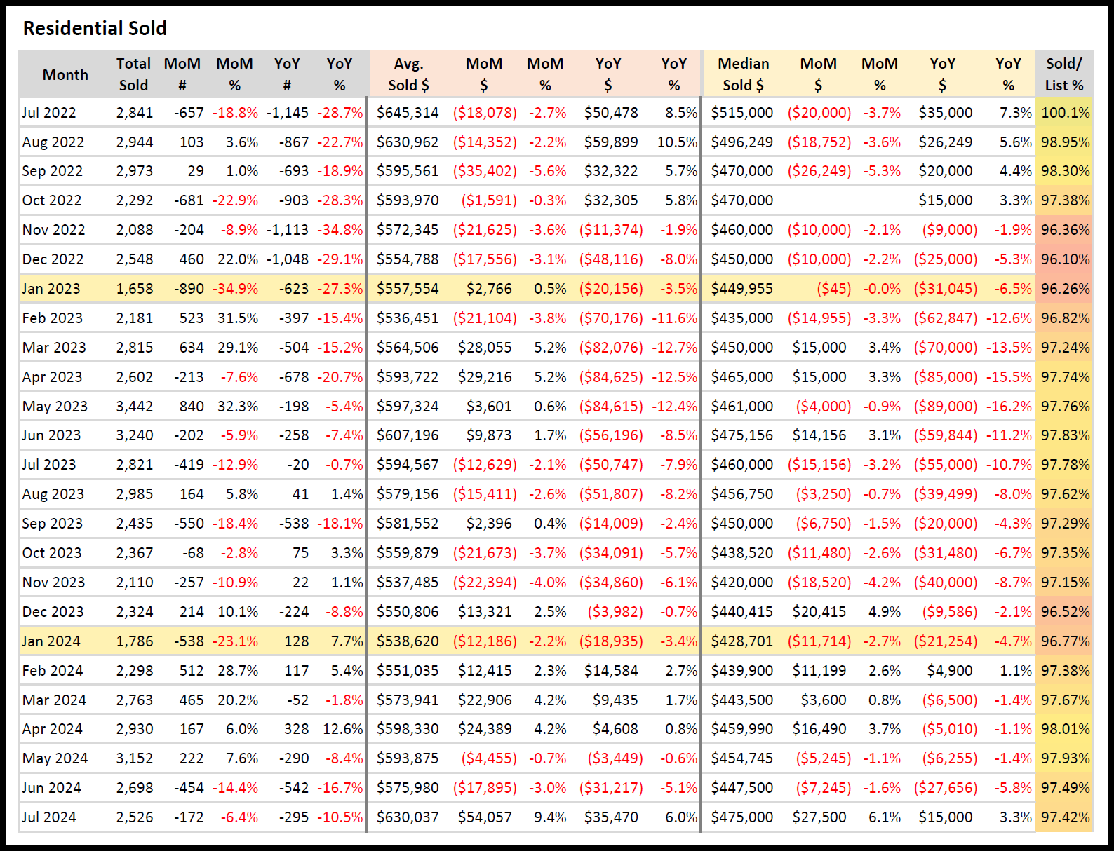 Another important metric to consider is the sold-to-list price ratio, which indicates how close the final selling price is to the initial listing price. In July 2024, the sold-to-list price ratio is 97.42%, slightly down from June 2024's ratio of 97.49%. This small decrease shows that homes are still selling relatively close to their asking prices, suggesting a competitive market where buyers are willing to meet sellers' pricing expectations.