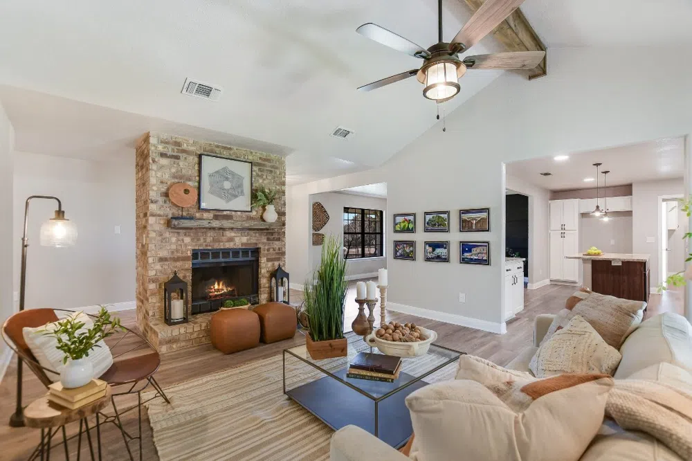 This updated home is located on 3.09 acres with gorgeous trees, lovely topography, two outbuildings, and a gazebo! 1,984 square feet, 3 bedrooms, two baths, open kitchen, family room, sun room/flex room, and enclosed patio. The island kitchen is opened to the dining area and the family room. Kitchen features include breakfast bar, granite counters, subway tile backsplash, an undermount deep sink, built-in storage and shelves, a 2024 stainless range with an air fryer, stainless dishwasher and microwave, walk-in pantry, recessed lights, and pendant lights. The family room provides lots of character with a beamed cathedral ceiling and fireplace. The spacious dining room offers a view of the front yard and easily accommodates a table for six and a buffet. The sun room is a flex area that offers countless uses, including a home office, home gym, music room, or a library, and provides a brick wall, bay window, built-in shelves, and a view of the back yard. The private primary suite provides room for a king bed, a pretty ceiling with a fan, views of the side yard, shelves, an oversized shower with large stylish subway tiles, double vanity with granite counters and rectangular sinks, a walk-in closet, and wood-like tile floors. Down the hall, you'll find two spacious bedrooms and a secondary bath with a double vanity with granite counters and rectangular sinks, a tub with large subway tile surround, a linen closet, and wood-like tile floors.This home has no carpet! One outbuilding has an AC unit, electricity, and a garage door. The second outbuilding has electricity and a garage door, and is 50% outfitted for one horse or goats. Other features include an indoor laundry room, covered front porch, metal roof, fenced-in area for children to play or dogs to run, asphalt driveway from the street to the home, a two-car garage, parking for at least 10 vehicles, a 2020 A/C, and a 2021 septic system. Nearby Copperas Cove has restaurants, shopping, and entertainment.