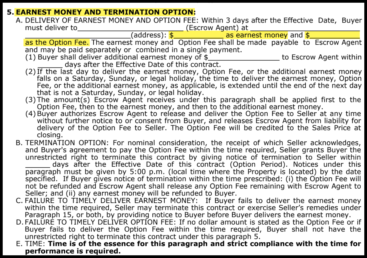 In Texas, the two most frequently encountered contingency fees in real estate transactions are the earnest money and the option money. Typically, the earnest money is equal to 1% of the sales price, while the option money is equal to 10% of the earnest money. However, it's important to note that these percentages are not set in stone and can vary depending on the specifics of each individual contract. For more information and guidance on these fees, please refer to our published guide titled "Type of Market / Type of Offer."